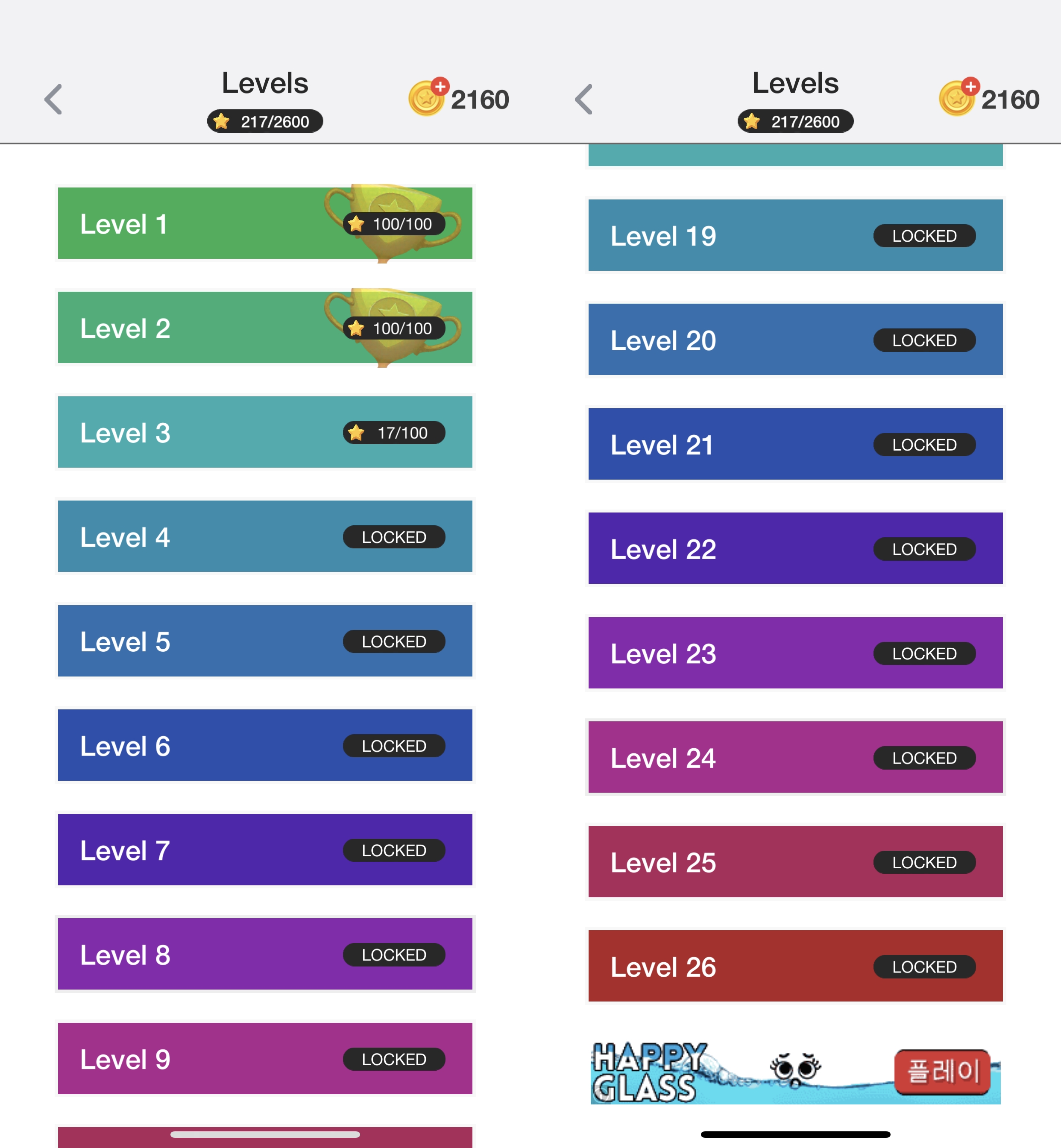 메인화면에서 ▶(플레이) 버튼을 누르면 레벨이 나오는데요!! 지금까지 총 26 레벨까지 나왔네요~ㅎㅎ