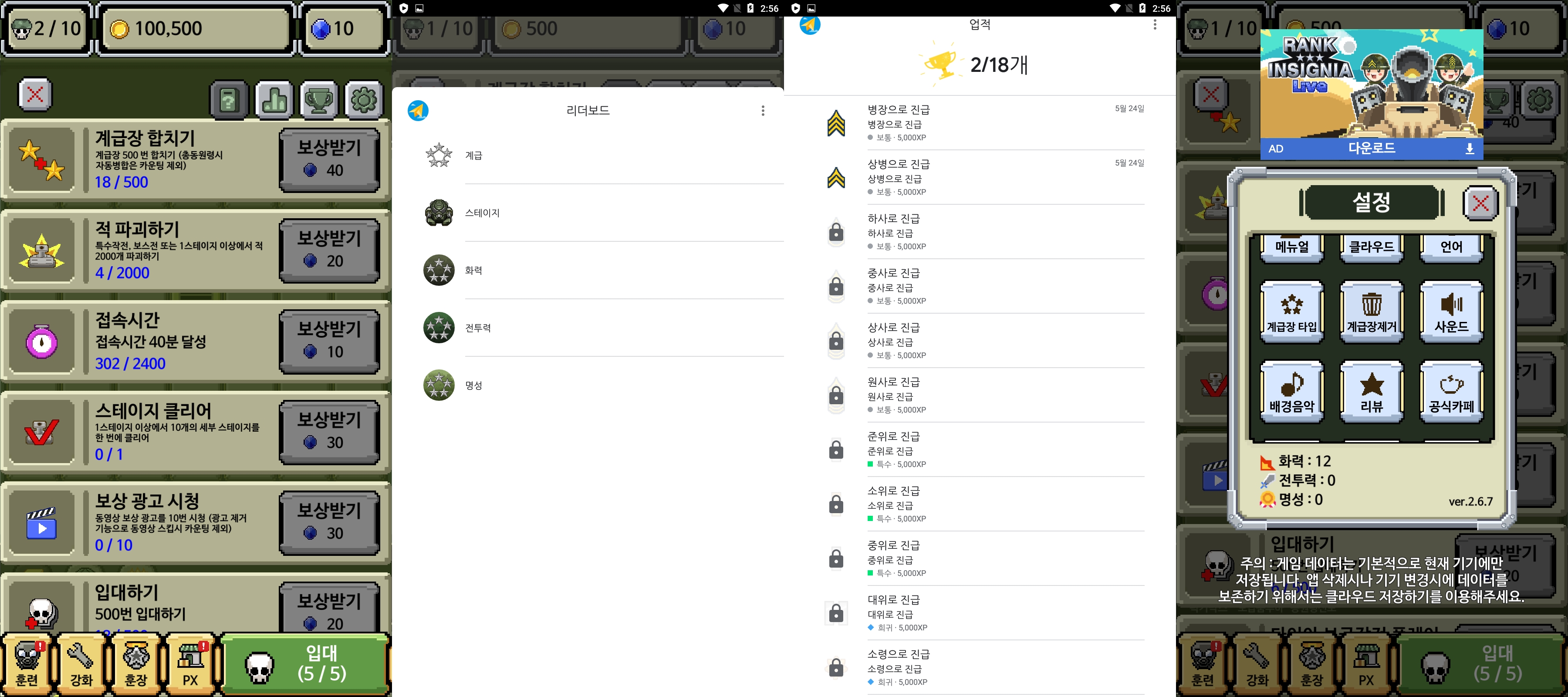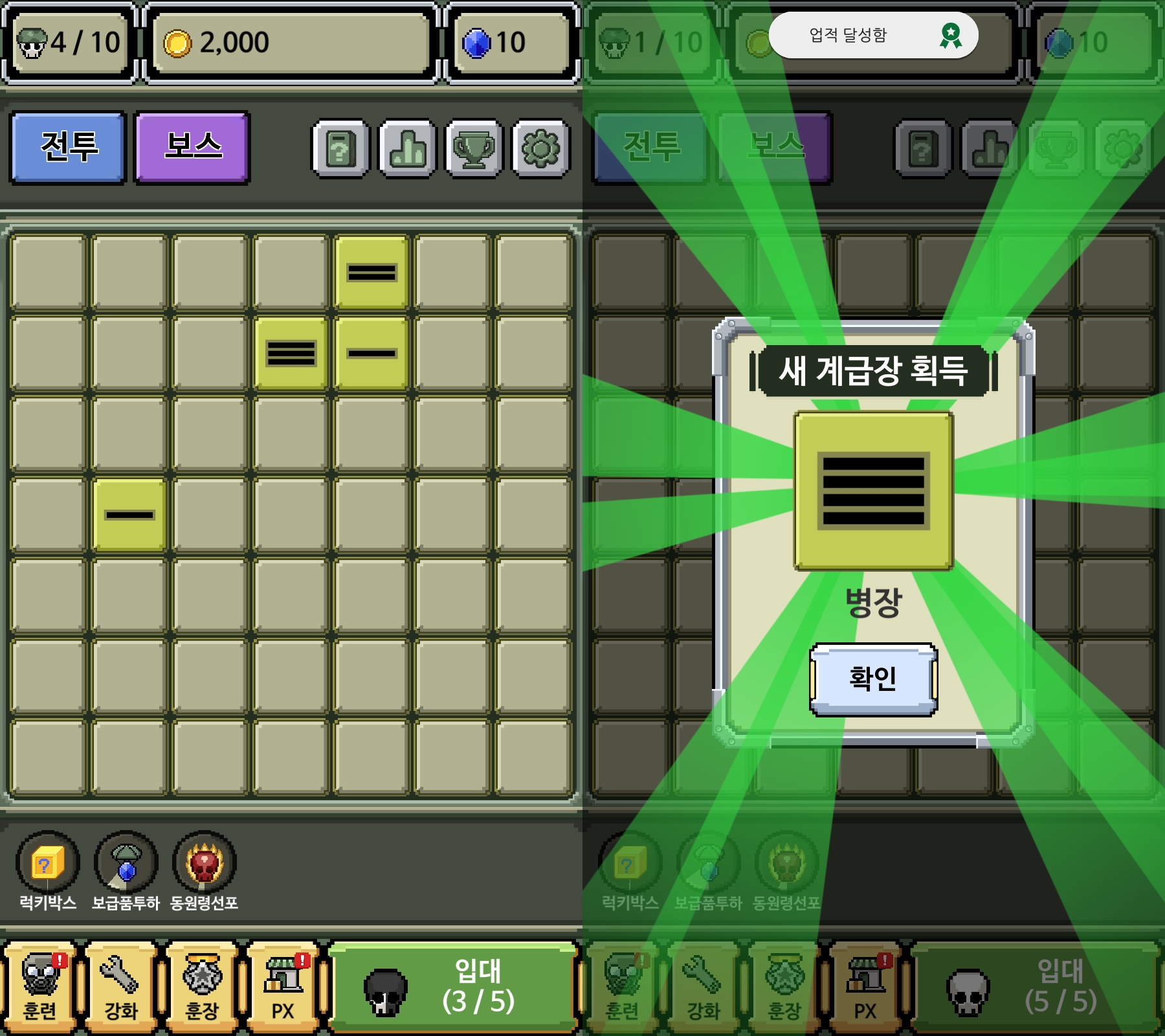 오른쪽 아래 "입대"라는 버튼을 누르면 계급장이 하나씩 나옵니다~ 손으로 드래그를 해서 같은 계급장을 합치면!!