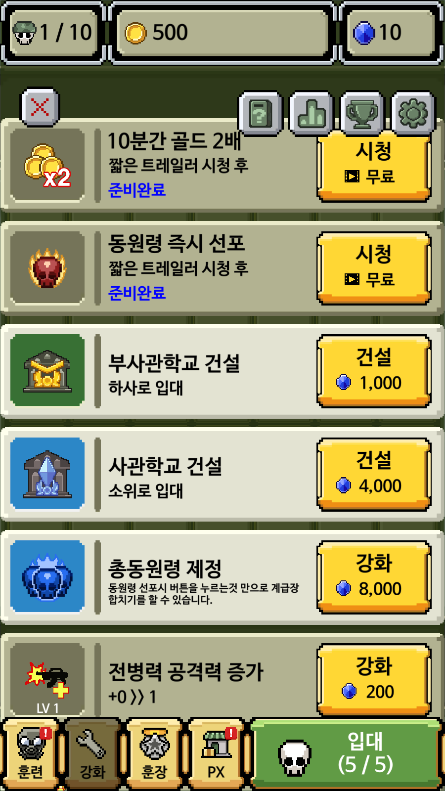 화면을 보시면 주요 메뉴가 전투, 보스, 훈련, 강화, 훈장, PX 이렇게 보이시죠?